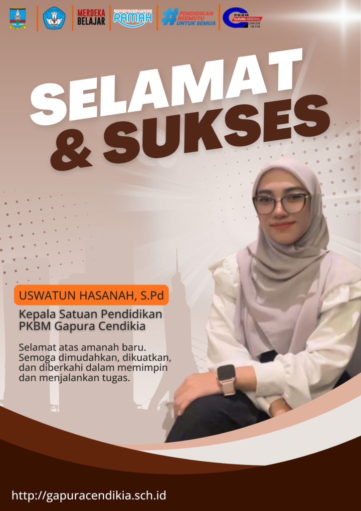 Perkenankan saya, Uswatun Hasanah, S.Pd, untuk memberikan sepatah dua patah kata bagi seluruh civitas akademika PKBM Gapura Cendikia pada kesempatan yang sangat istimewa ini. Sebagai Kepala Sekolah yang baru, saya merasa sangat bahagia dan bersyukur dapat bergabung dengan keluarga besar PKBM Gapura Cendikia yang terhormat.